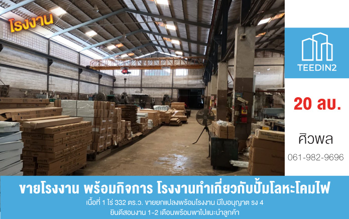 ขายโรงงานพร้อมกิจการผลิตโคมไฟโลหะ พื้นที่ใช้สอย 1 ไร่ 332 ตร.ม.